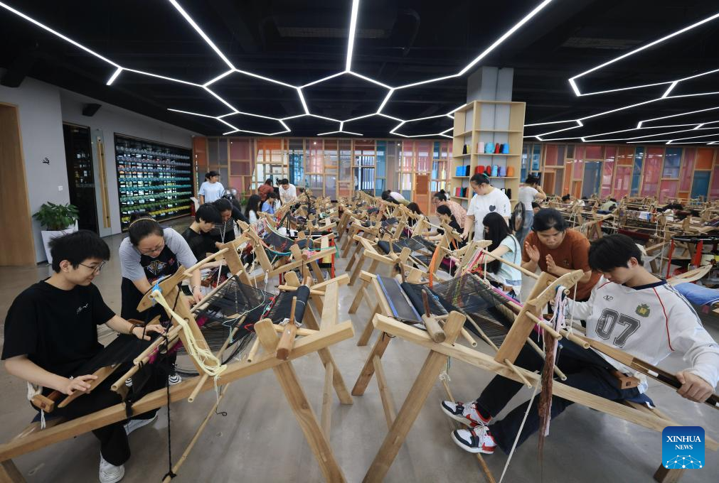 ZHANGJIAJIE, 10 junio, 2025 (Xinhua) -- Imagen del 9 de junio de 2025 de estudiantes universitarios intentando tejer tapices de la etnia tujia durante un viaje de estudio en un parque cultural y creativo, en Zhangjiajie, en la provincia de Hunan, en el centro de China. Ante la proximidad del Día del Patrimonio Cultural y Natural, la ciudad de Zhangjiajie de la provincia de Hunan, ha desarrollado una ruta turística temática sobre el patrimonio cultural inmaterial, con el fin de enriquecer el turismo local y al mismo tiempo proteger y heredar las artesanías populares. (Xinhua/Wu Yongbing)