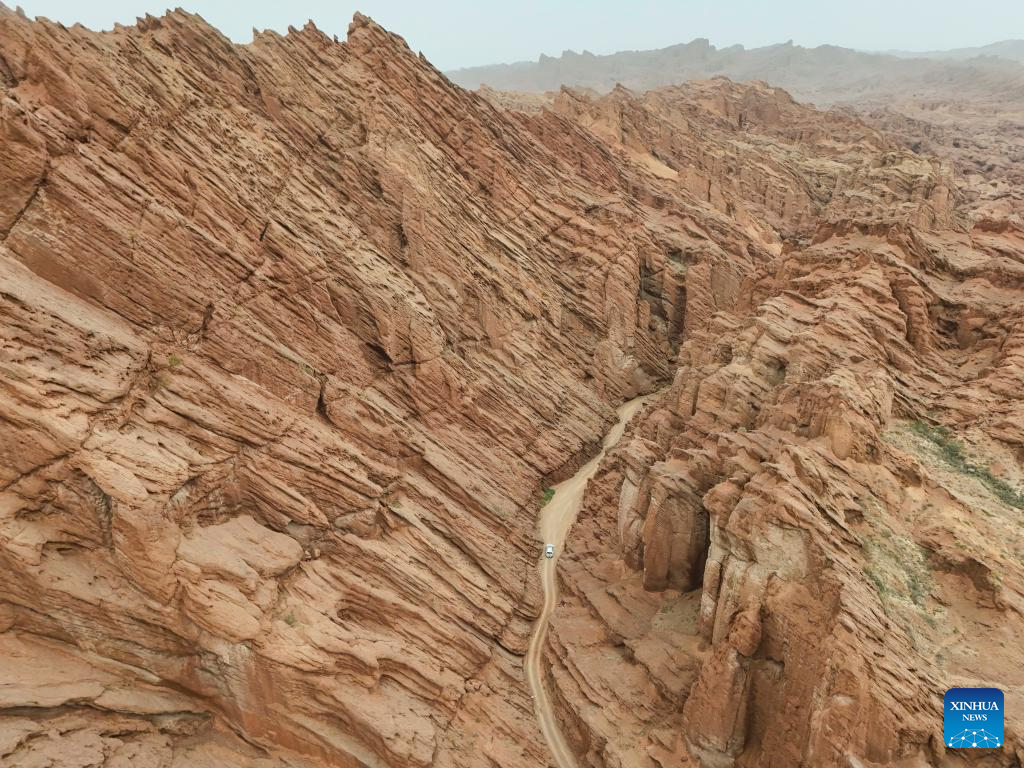 KUQA, 17 julio, 2025 (Xinhua) -- Vista aérea tomada con un dron de un vehículo en un cañón cerca de la autopista Duku, en la región autónoma uygur de Xinjiang, en el noroeste de China, el 17 de julio de 2025. La autopista Duku, en el noroeste de China, considerada una de las carreteras más pintorescas del país, experimenta un auge turístico en verano. La autopista de 561 kilómetros conecta Dushanzi, en el norte de Xinjiang, con la ciudad de Kuqa, en el sur, atravesando paisajes variados que incluyen cañones, glaciares, lagos y praderas. (Xinhua/Hu Huhu)