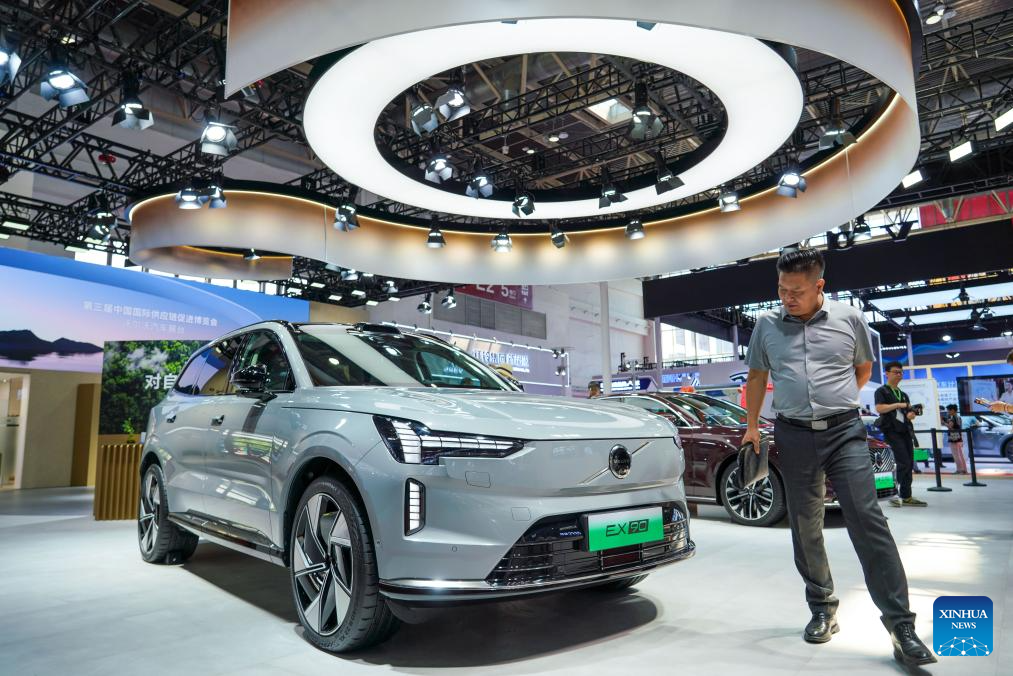 BEIJING, 17 julio, 2025 (Xinhua) -- Un visitante se informa sobre un vehículo en el estand de Volvo en el área de la Cadena de Vehículos Inteligentes de la III Exposición Internacional de la Cadena de Suministro de China (CISCE, por sus siglas en inglés), en Beijing, capital de China, el 17 de julio de 2025. Celebrada del 16 al 20 de julio, la CISCE 2025 comenzó el miércoles en Beijing. Una innovación clave de esta edición es la "Zona Debut", dedicada a los estrenos mundiales de nuevos productos, tecnologías y ecosistemas, presentando innovaciones revolucionarias que impulsan la colaboración industrial. (Xinhua/Wang Jingyi)