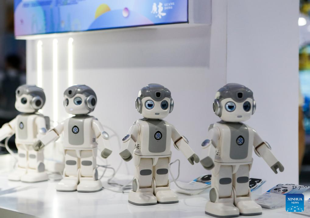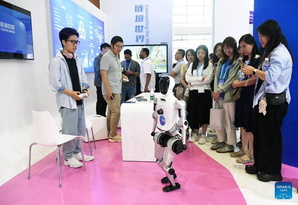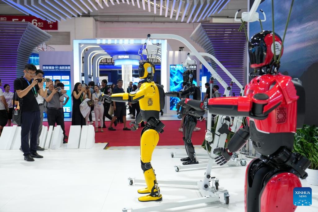 BEIJING, 17 julio, 2025 (Xinhua) -- Robots son vistos en el área de Cadena de Tecnología Digital de la III Exposición Internacional de la Cadena de Suministro de China (CISCE, por sus siglas en inglés), en Beijing, capital de China, el 17 de julio de 2025. Con el tema "Conectar el Mundo para un Futuro Compartido", la exposición, organizada por el Consejo Chino para la Promoción del Comercio Internacional, se inauguró el miércoles en Beijing. Celebrada del 16 al 20 de julio, la CISCE 2025 reunió a más de 650 empresas e instituciones de 75 países, regiones y organizaciones internacionales, junto con más de 500 de sus socios de oferta y demanda. (Xinhua/Ding Hongfa)