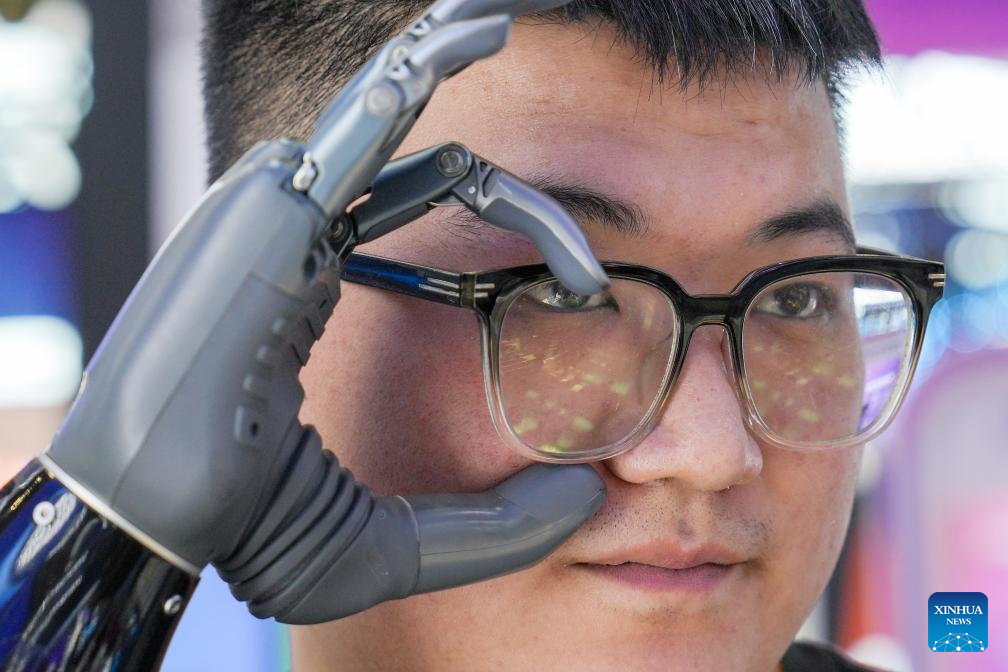 BEIJING, 17 julio, 2025 (Xinhua) -- Un empleado de la empresa tecnológica BrainCo usa una mano protésica inteligente para quitarse las gafas en el área de la Cadena de Tecnología Digital de la III Exposición Internacional de la Cadena de Suministro de China (CISCE, por sus siglas en inglés), en Beijing, capital de China, el 17 de julio de 2025. Celebrada del 16 al 20 de julio, la CISCE 2025 comenzó el miércoles en Beijing. Una innovación clave de esta edición es la "Zona Debut", dedicada a los estrenos mundiales de nuevos productos, tecnologías y ecosistemas, presentando innovaciones revolucionarias que impulsan la colaboración industrial. (Xinhua/Ju Huanzong)