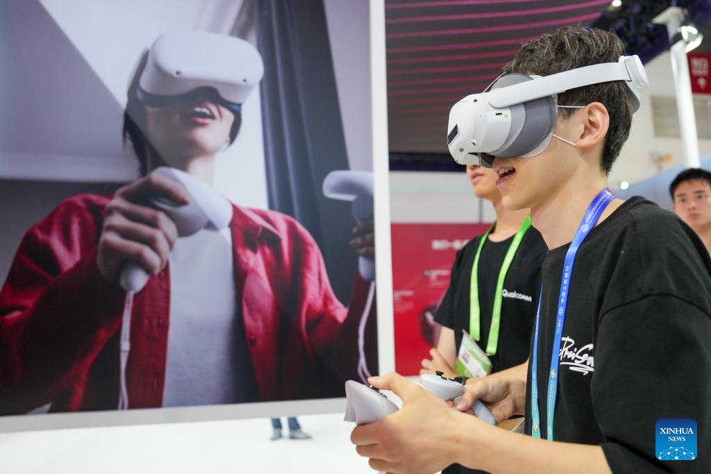 BEIJING, 17 julio, 2025 (Xinhua) -- Un visitante prueba un producto en el estand de Qualcomm en el área de la Cadena de Tecnología Digital de la III Exposición Internacional de la Cadena de Suministro de China (CISCE, por sus siglas en inglés), en Beijing, capital de China, el 17 de julio de 2025. Celebrada del 16 al 20 de julio, la CISCE 2025 comenzó el miércoles en Beijing. Una innovación clave de esta edición es la "Zona Debut", dedicada a los estrenos mundiales de nuevos productos, tecnologías y ecosistemas, presentando innovaciones revolucionarias que impulsan la colaboración industrial. (Xinhua/Ju Huanzong)