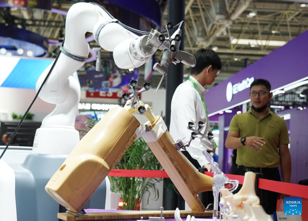 BEIJING, 17 julio, 2025 (Xinhua) -- Un robot quirúrgico ortopédico impulsado por IA es visto en el área de la Cadena de Vida Saludable de la III Exposición Internacional de la Cadena de Suministro de China (CISCE, por sus siglas en inglés), en Beijing, capital de China, el 17 de julio de 2025. Celebrada del 16 al 20 de julio, la CISCE 2025 comenzó el miércoles en Beijing. Una innovación clave de esta edición es la "Zona Debut", dedicada a los estrenos mundiales de nuevos productos, tecnologías y ecosistemas, presentando innovaciones revolucionarias que impulsan la colaboración industrial. (Xinhua/Zhang Chenlin)