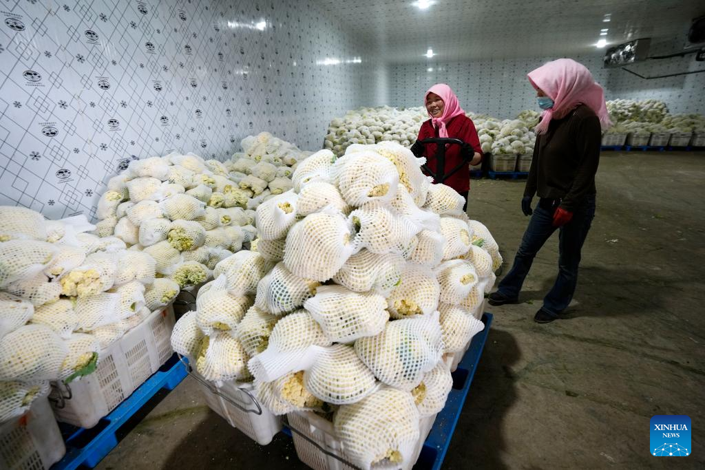 GUYUAN, 18 julio, 2025 (Xinhua) -- Trabajadoras transportan coliflor en una base de verduras de temporada fría, en Guyuan, en la región autónoma hui de Ningxia, en el noroeste de China, el 18 de julio de 2025. Aprovechando sus ventajas del terreno de gran altitud y del clima frío, Guyuan ha desarrollado vigorosamente su industria de verduras de temporada fría en los últimos años. (Xinhua/Wang Peng)