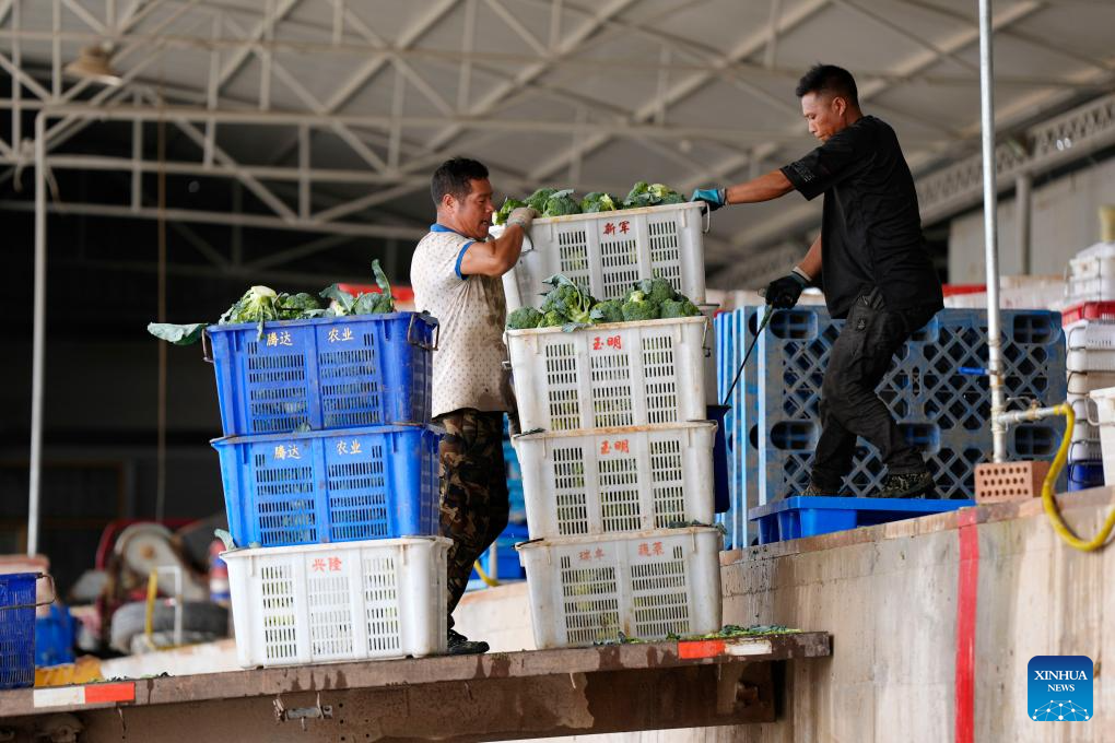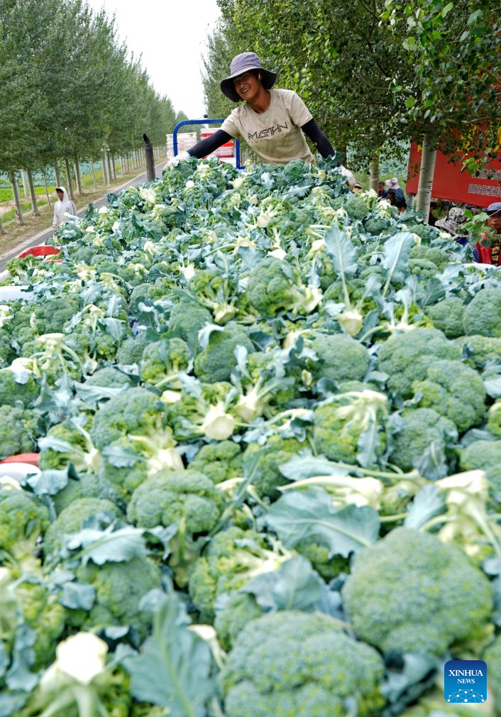 GUYUAN, 18 julio, 2025 (Xinhua) -- Trabajadores transportan brócoli en una base de verduras de temporada fría, en Guyuan, en la región autónoma hui de Ningxia, en el noroeste de China, el 18 de julio de 2025. Aprovechando sus ventajas del terreno de gran altitud y del clima frío, Guyuan ha desarrollado vigorosamente su industria de verduras de temporada fría en los últimos años. (Xinhua/Wang Peng)