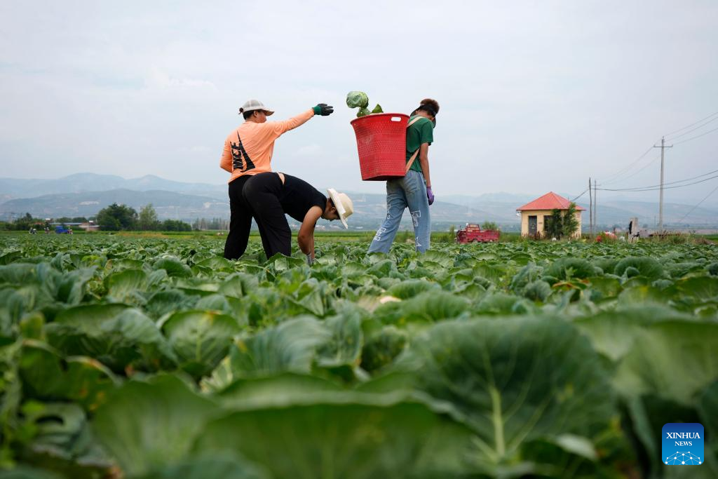 GUYUAN, 18 julio, 2025 (Xinhua) -- Trabajadoras cosechan coles en una base de verduras de temporada fría, en Guyuan, en la región autónoma hui de Ningxia, en el noroeste de China, el 18 de julio de 2025. Aprovechando sus ventajas del terreno de gran altitud y del clima frío, Guyuan ha desarrollado vigorosamente su industria de verduras de temporada fría en los últimos años. (Xinhua/Wang Peng)