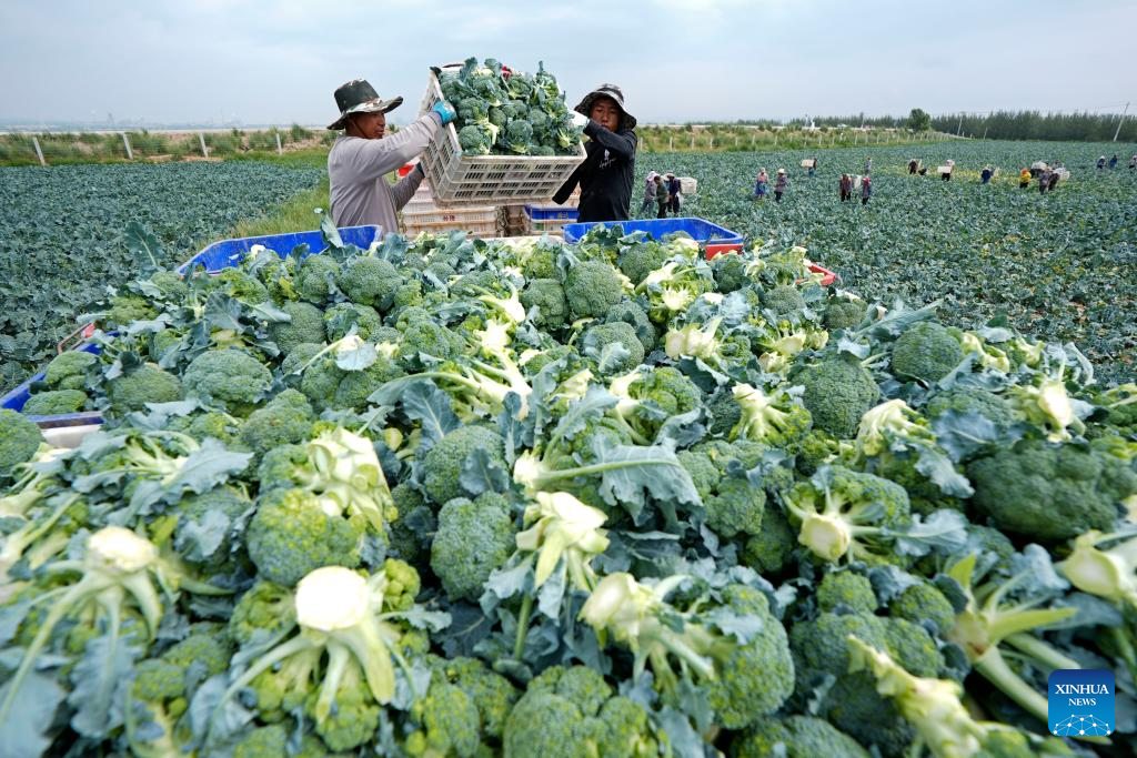 GUYUAN, 18 julio, 2025 (Xinhua) -- Trabajadores cosechan brócoli en una base de verduras de temporada fría, en Guyuan, en la región autónoma hui de Ningxia, en el noroeste de China, el 18 de julio de 2025. Aprovechando sus ventajas del terreno de gran altitud y del clima frío, Guyuan ha desarrollado vigorosamente su industria de verduras de temporada fría en los últimos años. (Xinhua/Wang Peng)