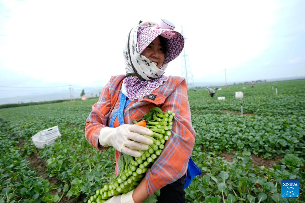 GUYUAN, 18 julio, 2025 (Xinhua) -- Una trabajadora cosecha coles chinas en flor en una base de verduras de temporada fría, en Guyuan, en la región autónoma hui de Ningxia, en el noroeste de China, el 18 de julio de 2025. Aprovechando sus ventajas del terreno de gran altitud y del clima frío, Guyuan ha desarrollado vigorosamente su industria de verduras de temporada fría en los últimos años. (Xinhua/Wang Peng)