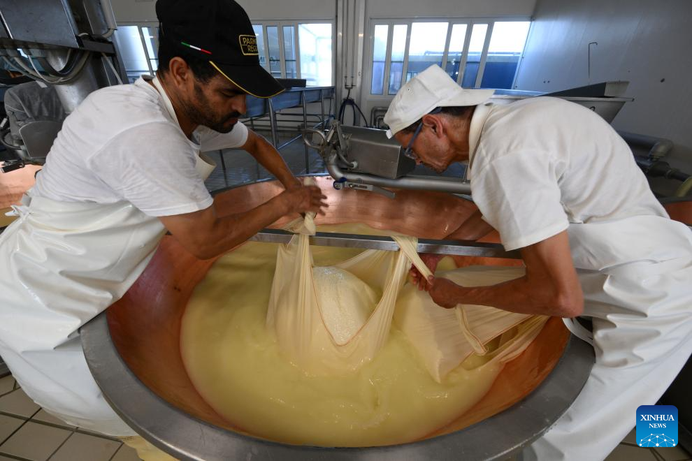 PARMA, 18 julio, 2025 (Xinhua) -- Imagen del 17 de julio de 2025 de trabajadores de la quesería Caseificio San Bernardino utilizando una tela de lino para levantar los gránulos de queso de una tina de cobre durante la producción de Parmigiano Reggiano en Caseificio San Bernardino, en Tortiano, Parma, Italia. El famoso queso Parmigiano Reggiano de Italia se elabora con leche de vaca y se produce exclusivamente en algunas regiones del norte de Italia. (Xinhua/Alberto Lingria)