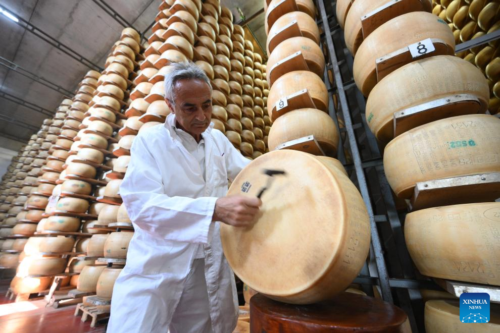 PARMA, 18 julio, 2025 (Xinhua) -- Imagen del 17 de julio de 2025 de un trabajador de control de calidad inspeccionando un producto de Parmigiano Reggiano en la quesería Caseificio San Bernardino, en Tortiano, Parma, Italia. El famoso queso Parmigiano Reggiano de Italia se elabora con leche de vaca y se produce exclusivamente en algunas regiones del norte de Italia. (Xinhua/Alberto Lingria)