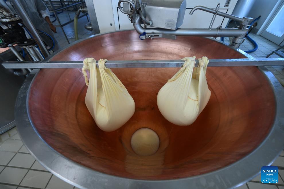 PARMA, 18 julio, 2025 (Xinhua) -- Imagen del 17 de julio de 2025 de la tela de lino siendo utilizada para levantar los gránulos de queso de una tina de cobre durante la producción de Parmigiano Reggiano en Caseificio San Bernardino, en Tortiano, Parma, Italia. El famoso queso Parmigiano Reggiano de Italia se elabora con leche de vaca y se produce exclusivamente en algunas regiones del norte de Italia. (Xinhua/Alberto Lingria)