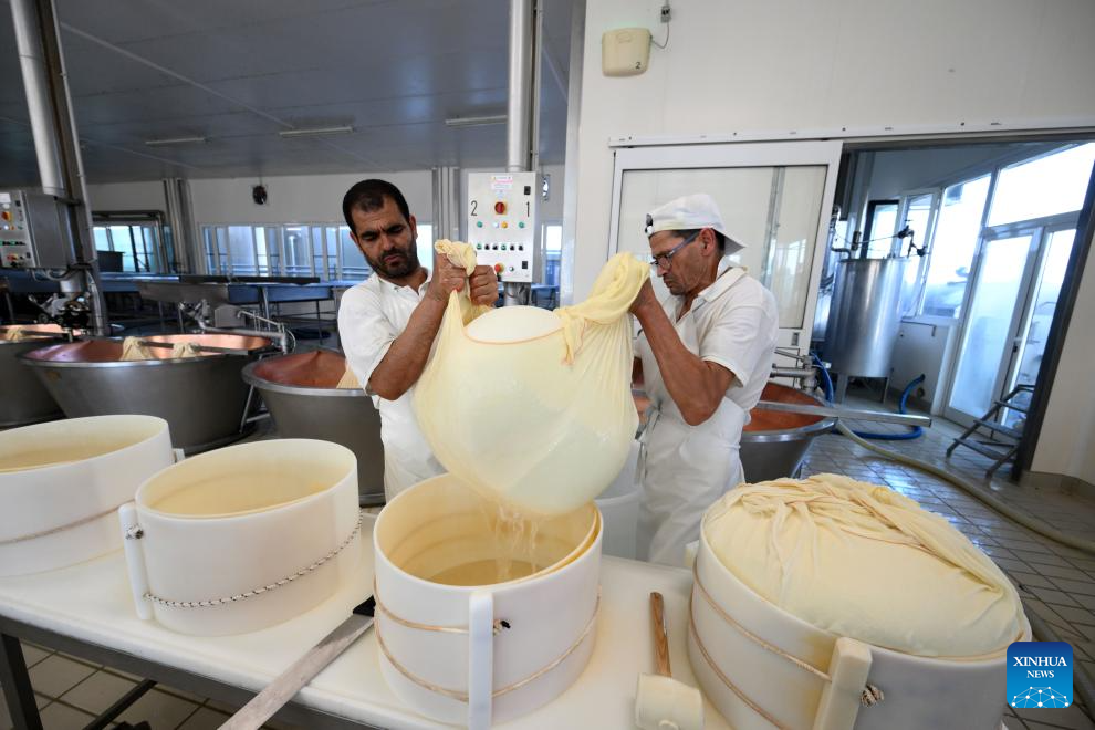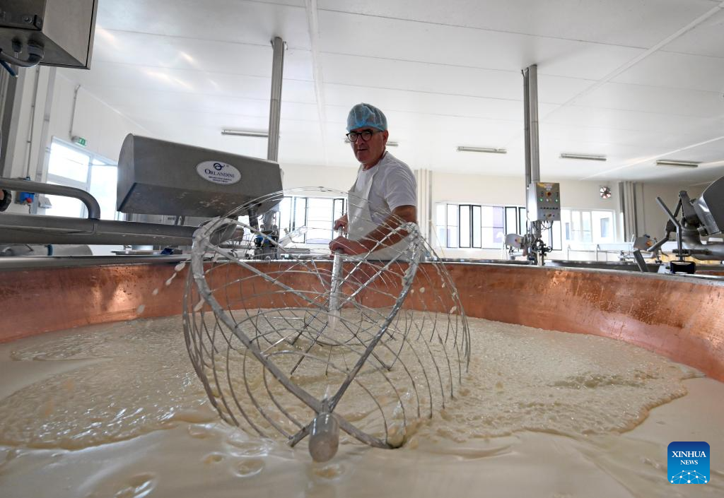 PARMA, 18 julio, 2025 (Xinhua) -- Imagen del 17 de julio de 2025 de Daniele Dadomo, conocido como "Casaro", el quesero, trabajando con Parmigiano Reggiano en la quesería Caseificio San Bernardino, en Tortiano, Parma, Italia. El famoso queso Parmigiano Reggiano de Italia se elabora con leche de vaca y se produce exclusivamente en algunas regiones del norte de Italia. (Xinhua/Alberto Lingria)