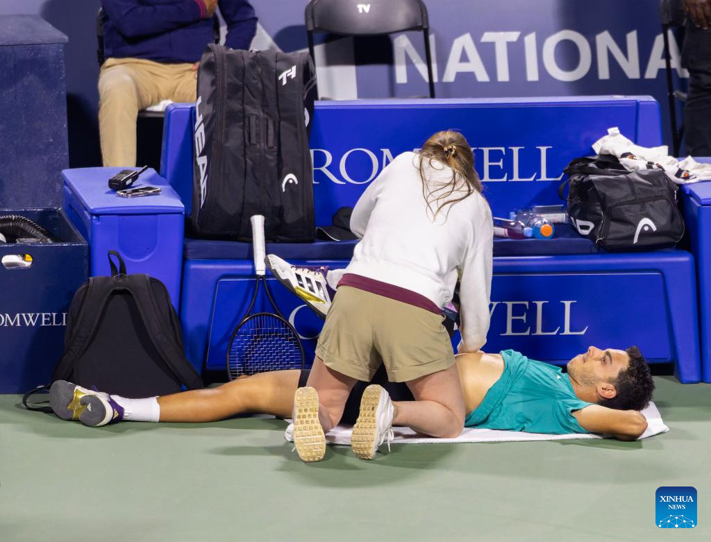 TORONTO, 3 agosto, 2025 (Xinhua) -- Imagen del 2 de agosto de 2025 de Francisco Cerúndolo (abajo), recibiendo tratamiento médico durante el partido de octavos de final de individuales masculinos entre Alexander Zverev, de Alemania, y Francisco Cerúndolo, de Argentina, en el torneo de tenis Abierto National Bank 2025, en Toronto, Canadá. (Xinhua/Zou Zheng)