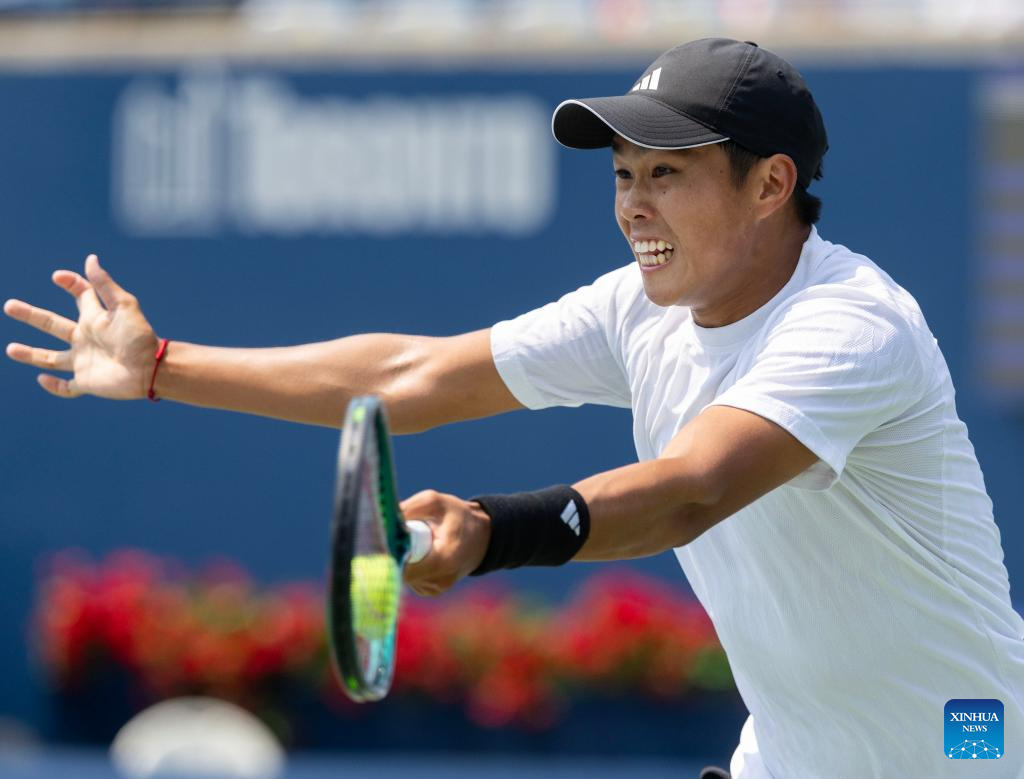 TORONTO, 3 agosto, 2025 (Xinhua) -- Imagen del 2 de agosto de 2025 de Learner Tien, de Estados Unidos, devolviendo la pelota durante el partido de octavos de final de individuales masculinos entre Alex Michelsen, de Estados Unidos, y Learner Tien, de Estados Unidos, en el torneo de tenis Abierto National Bank 2025, en Toronto, Canadá. (Xinhua/Zou Zheng)