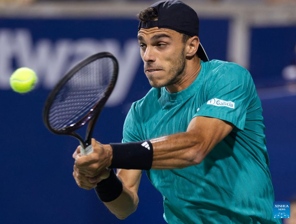 TORONTO, 3 agosto, 2025 (Xinhua) -- Imagen del 2 de agosto de 2025 de Francisco Cerúndolo devolviendo la pelota durante el partido de octavos de final de individuales masculinos entre Alexander Zverev, de Alemania, y Francisco Cerúndolo, de Argentina, en el torneo de tenis Abierto National Bank 2025, en Toronto, Canadá. (Xinhua/Zou Zheng)