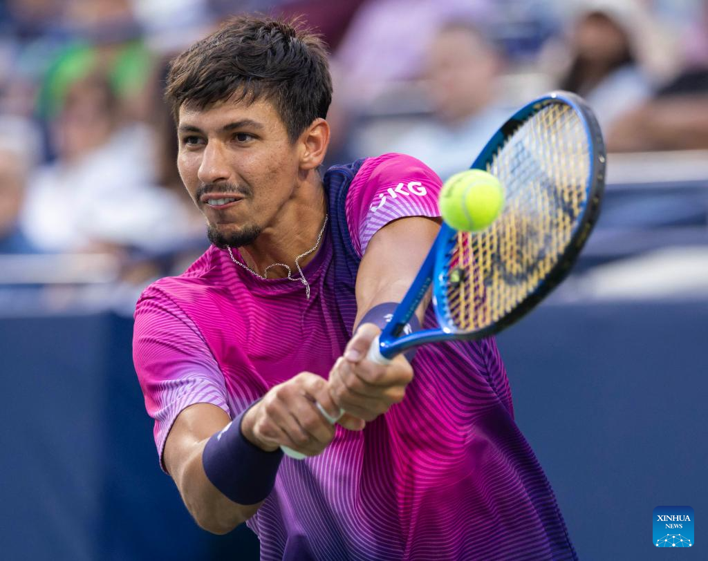 TORONTO, 3 agosto, 2025 (Xinhua) -- Imagen del 2 de agosto de 2025 de Alexei Popyrin, de Australia, devolviendo la pelota durante el partido de octavos de final de individuales masculinos entre Alexei Popyrin, de Australia, y Holger Rune, de Dinamarca, en el torneo de tenis Abierto National Bank 2025, en Toronto, Canadá. (Xinhua/Zou Zheng)