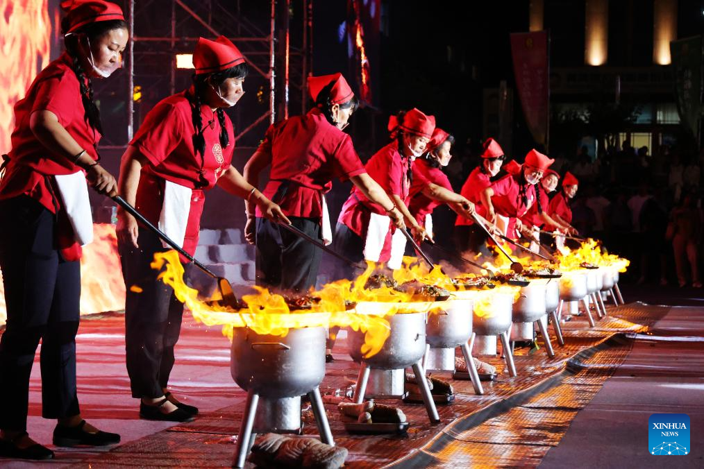 ZHANGYE, 3 agosto, 2025 (Xinhua) -- Imagen del 2 de agosto de 2025 de cocineros realizando una presentación sobre la preparación de Chaobola, una comida callejera enlistada como patrimonio cultural inmaterial a nivel municipal, en un festival de comida, en Zhangye, en la provincia de Gansu, en el noroeste de China. (Xinhua/Cheng Lin)