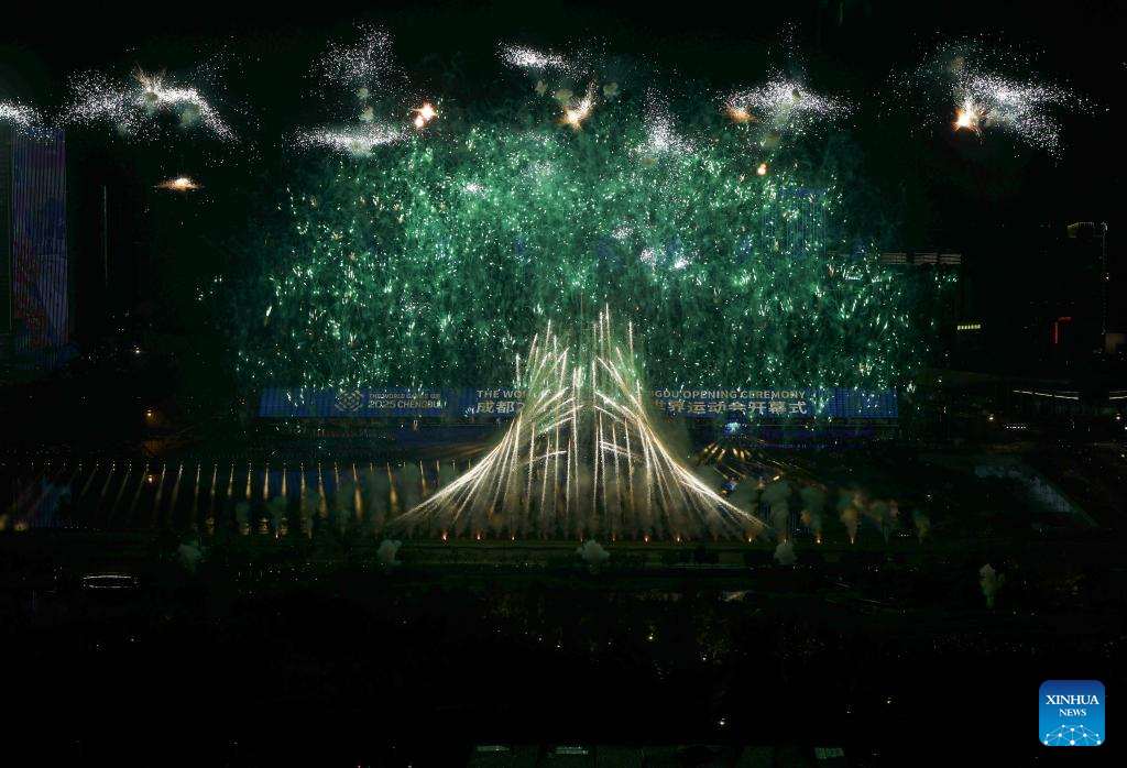 CHENGDU, 7 agosto, 2025 (Xinhua) -- Fuegos artificiales son vistos durante la ceremonia de inauguración de los Juegos Mundiales 2025, en Chengdu, en la provincia de Sichuan, en el suroeste de China, el 7 de agosto de 2025. (Xinhua/Zhang Bowen)