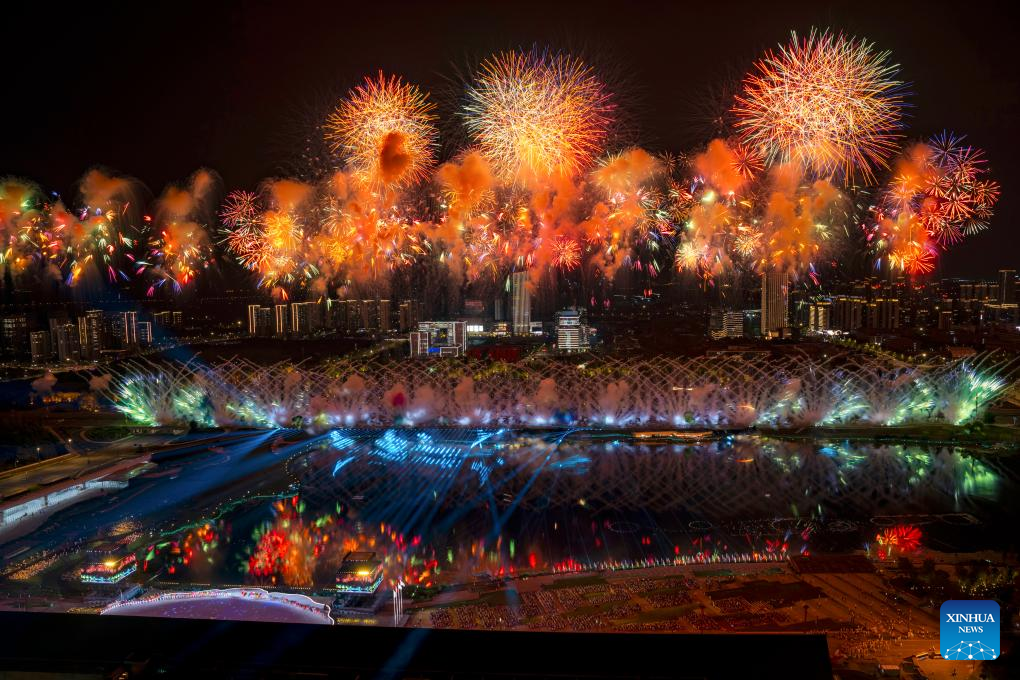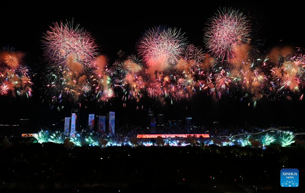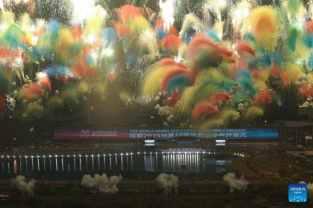 CHENGDU, 7 agosto, 2025 (Xinhua) -- Fuegos artificiales son vistos durante la ceremonia de inauguración de los Juegos Mundiales 2025, en Chengdu, en la provincia de Sichuan, en el suroeste de China, el 7 de agosto de 2025. (Xinhua/Chen Yichen)