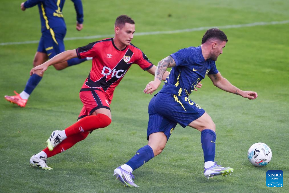 MADRID, 7 agosto, 2025 (Xinhua) -- Imagen del 6 de agosto de 2025 de Javi Galán (d), de Atlético de Madrid, disputando el balón con Jorge de Frutos, de Rayo Vallecano, durante el partido amistoso, entre Atlético de Madrid y Rayo Vallecano, en Madrid, España. (Xinhua/Gustavo Valiente)