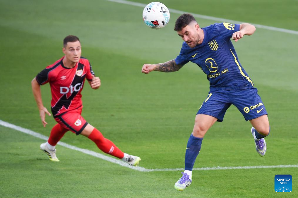 MADRID, 7 agosto, 2025 (Xinhua) -- Imagen del 6 de agosto de 2025 de Javi Galán (d), de Atlético de Madrid, cabeceando el balón durante el partido amistoso, entre Atlético de Madrid y Rayo Vallecano, en Madrid, España. (Xinhua/Gustavo Valiente)