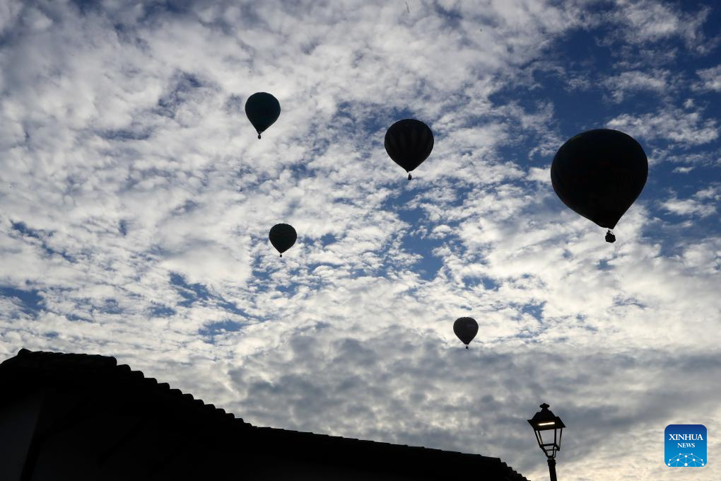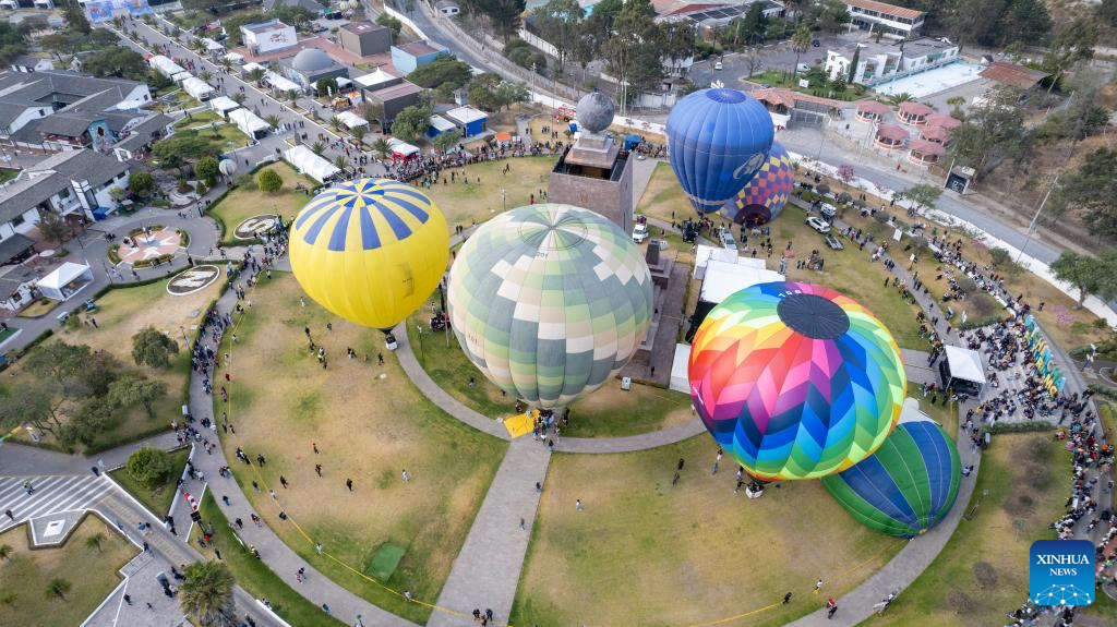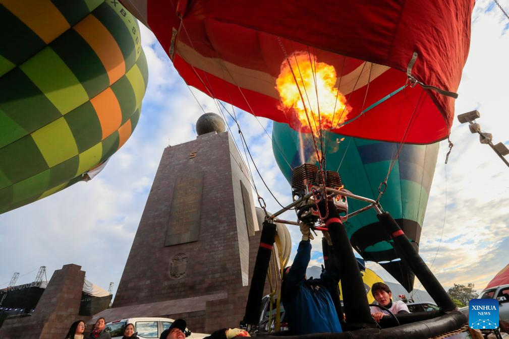 QUITO, 8 agosto, 2025 (Xinhua) -- Globos aerostáticos vuelan durante el cuarto Festival Internacional del Globo Mitad del Mundo, en la ciudad de Quito, capital de Ecuador, el 8 de agosto de 2025. (Xinhua/Ricardo Landeta)