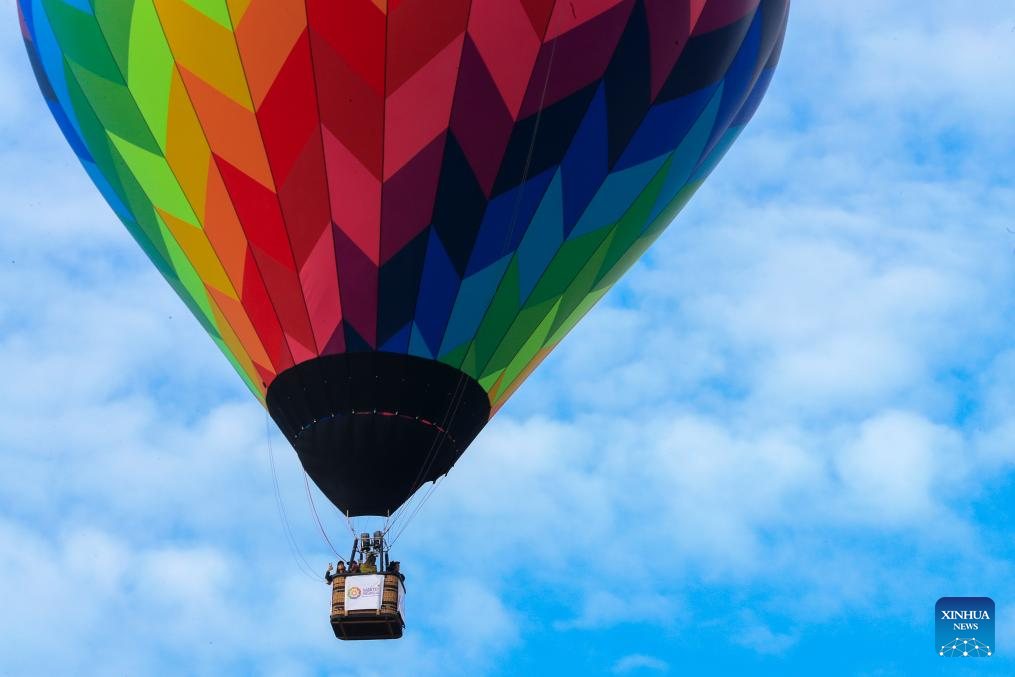 QUITO, 8 agosto, 2025 (Xinhua) -- Un globo aerostático vuela durante el cuarto Festival Internacional del Globo Mitad del Mundo, en la ciudad de Quito, capital de Ecuador, el 8 de agosto de 2025. (Xinhua/Ricardo Landeta)