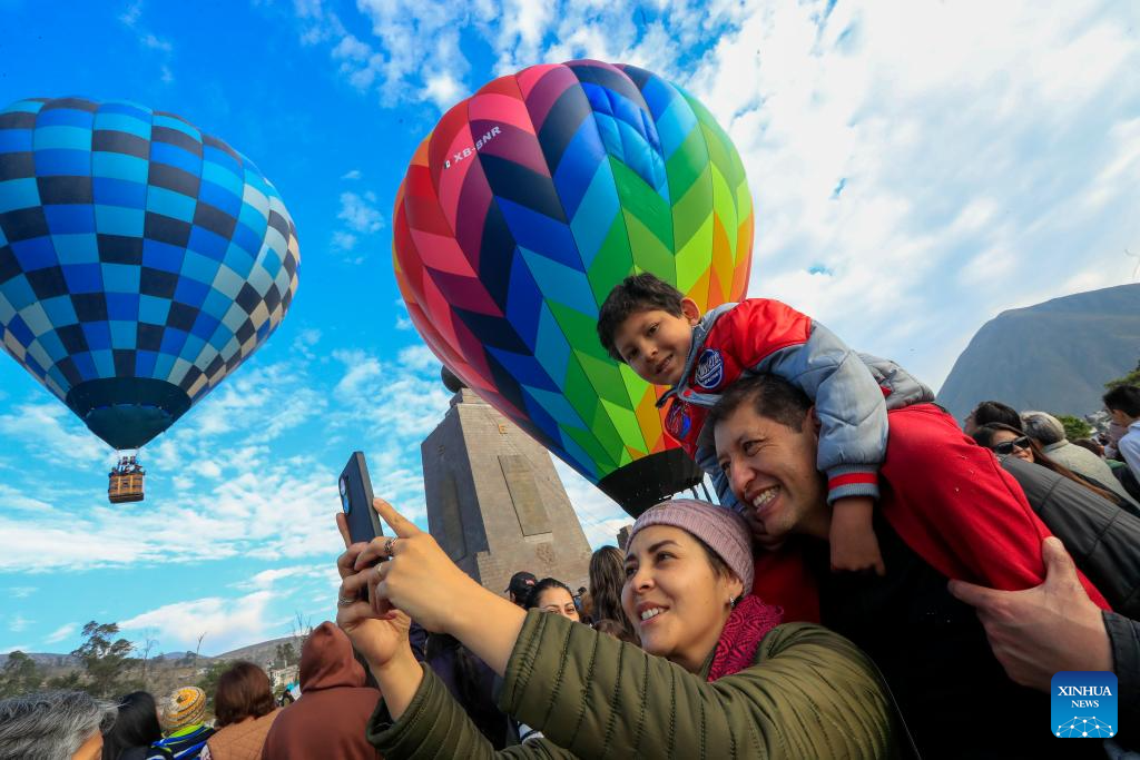 QUITO, 8 agosto, 2025 (Xinhua) -- Una familia se toma una fotografía durante el cuarto Festival Internacional del Globo Mitad del Mundo, en la ciudad de Quito, capital de Ecuador, el 8 de agosto de 2025. (Xinhua/Ricardo Landeta)
