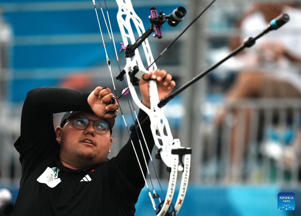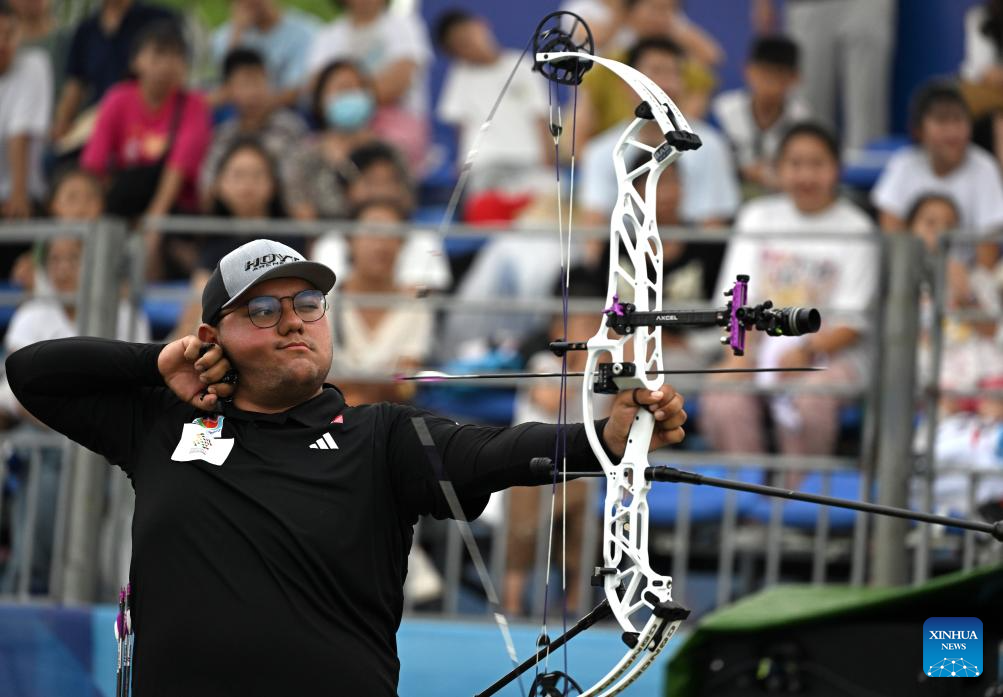 CHENGDU, 8 agosto, 2025 (Xinhua) -- Sebastián García Flores, de México, compite durante el encuentro por la medalla de oro de compuesto por equipos mixtos del evento de tiro con arco entre Dinamarca y México en los Juegos Mundiales 2025, en Chengdu, en la provincia de Sichuan, en el suroeste de China, el 8 de agosto de 2025. (Xinhua/Li Jianan)