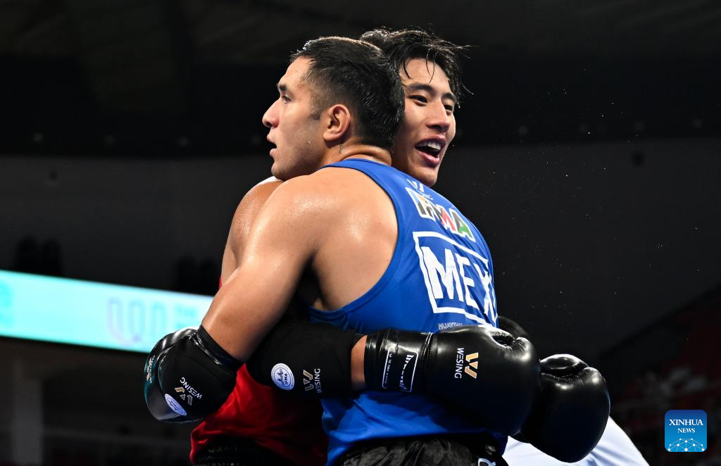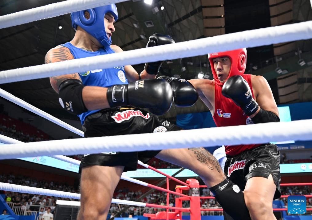 CHENGDU, 8 agosto, 2025 (Xinhua) -- Juan Antonio Hernández Totomol (d), de México, compite ante Zhang Chengcheng, de China, compiten durante los cuartos de final de -86 kg masculinos del evento de muay thai en los Juegos Mundiales 2025, en Chengdu, en la provincia de Sichuan, en el suroeste de China, el 8 de agosto de 2025. (Xinhua/Zhang Bowen)