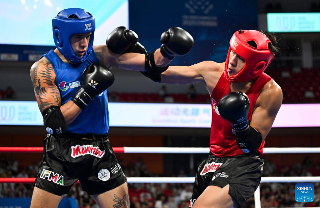 CHENGDU, 8 agosto, 2025 (Xinhua) -- Zhang Chengcheng (d), de China, compite ante Juan Antonio Hernández Totomol, de México, durante los cuartos de final de -86 kg masculinos del evento de muay thai en los Juegos Mundiales 2025, en Chengdu, en la provincia de Sichuan, en el suroeste de China, el 8 de agosto de 2025. (Xinhua/Zhang Bowen)