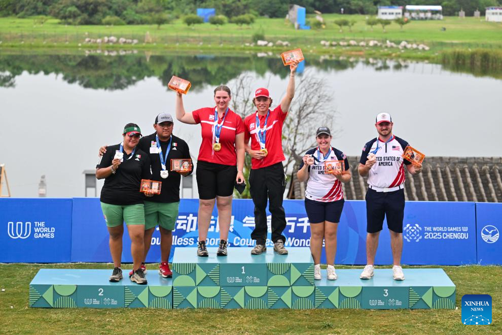 CHENGDU, 8 agosto, 2025 (Xinhua) -- Los medallistas de oro Mathias Bertrand Fullerton (3-d)/Sofie Louise Dam Marcussen (3-i), de Dinamarca, los medallistas de plata Sebastián García Flores (2-i)/Andrea Maya Becerra Arizaga (i), de México, y los medallistas de bronce Alexis Mercedes Ruiz (2-d)/Curtis Lee Broadnax, de Estados Unidos, posan durante la ceremonia de premiación del encuentro de compuesto por equipos mixtos del evento de tiro con arco en los Juegos Mundiales 2025, en Chengdu, en la provincia de Sichuan, en el suroeste de China, el 8 de agosto de 2025. (Xinhua/Yang Wenbin)