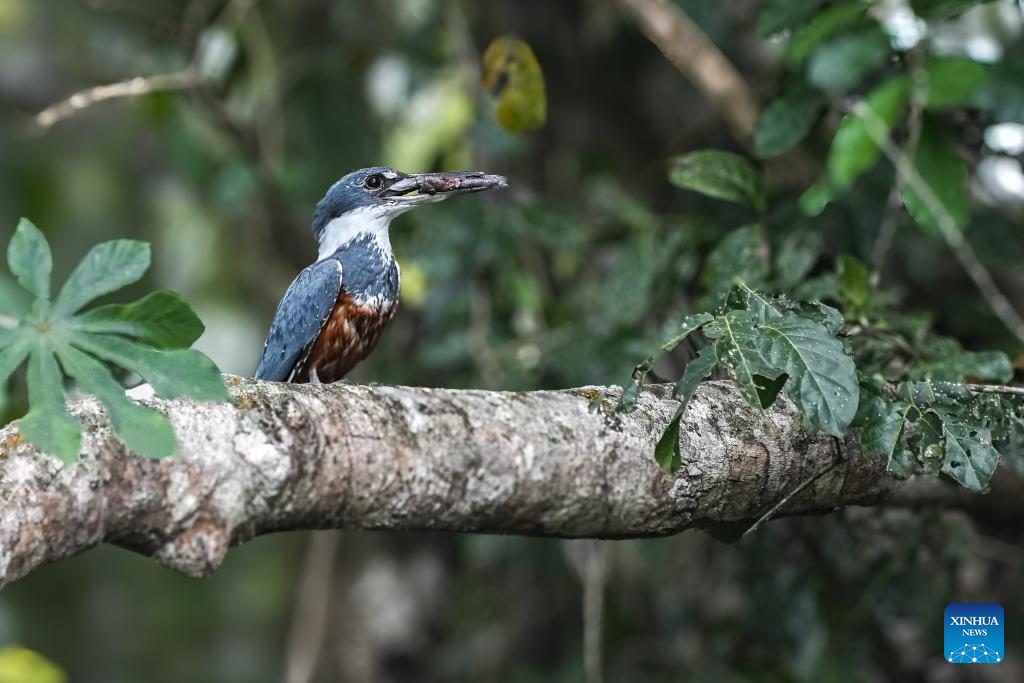 MATO GROSSO DO SUL, 9 agosto, 2025 (Xinhua) -- Imagen del 7 de agosto de 2025 de un martín pescador posándose sobre una rama de un árbol en la orilla del río Salobra, en el Pantanal Sur, en la ciudad de Miranda, en el estado de Mato Grosso do Sul, Brasil. (Xinhua/Paulo Lopes)