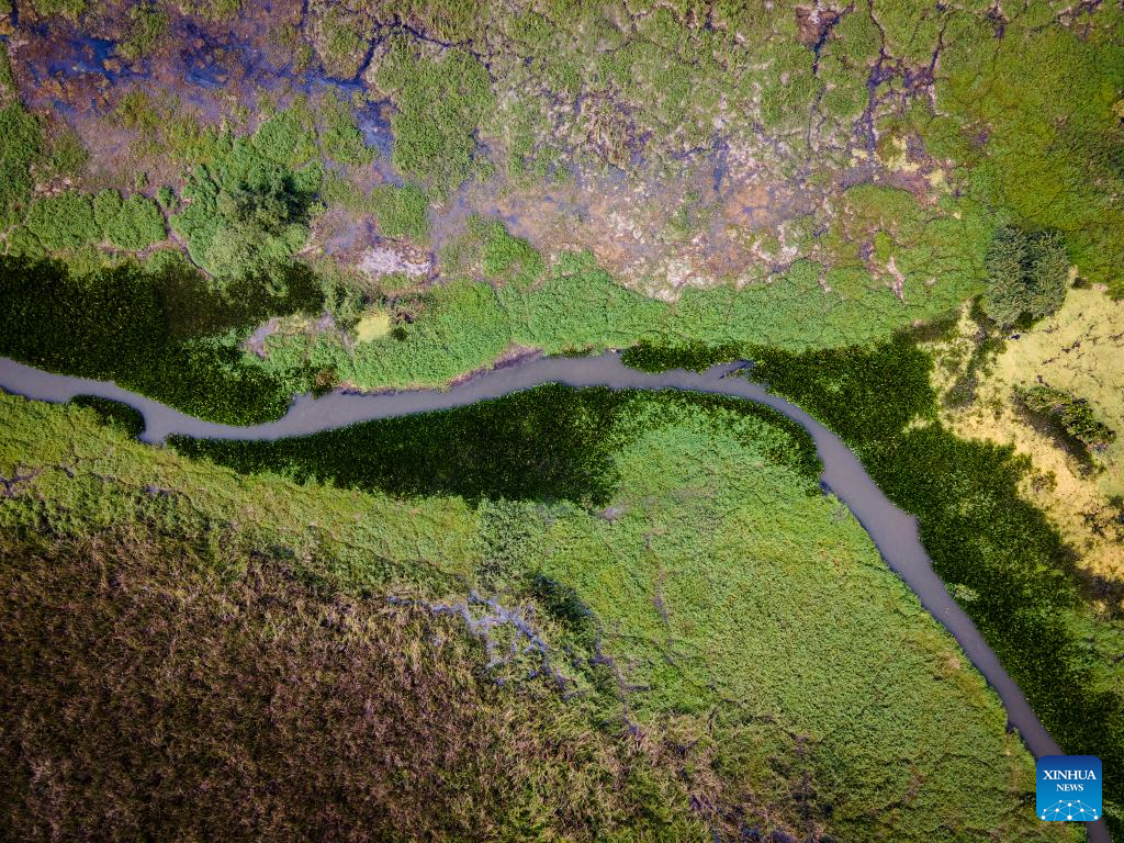 MATO GROSSO DO SUL, 9 agosto, 2025 (Xinhua) -- Vista aérea tomada con un dron el 6 de agosto de 2025 del río Miranda en el Pantanal Sur, en la ciudad de Aquidauana, en el estado de Mato Grosso do Sul, Brasil. (Xinhua/Paulo Lopes)