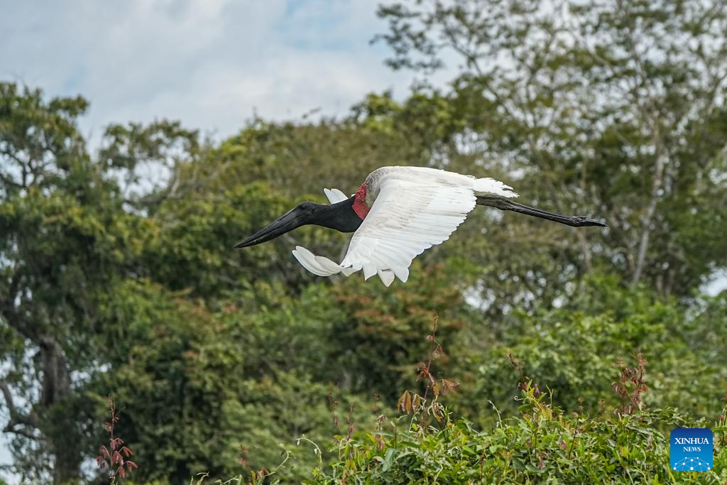 MATO GROSSO DO SUL, 9 agosto, 2025 (Xinhua) -- Imagen del 7 de agosto de 2025 de un jabirú volando en el Pantanal Sur, en la ciudad de Miranda, en el estado de Mato Grosso do Sul, Brasil. (Xinhua/Paulo Lopes)