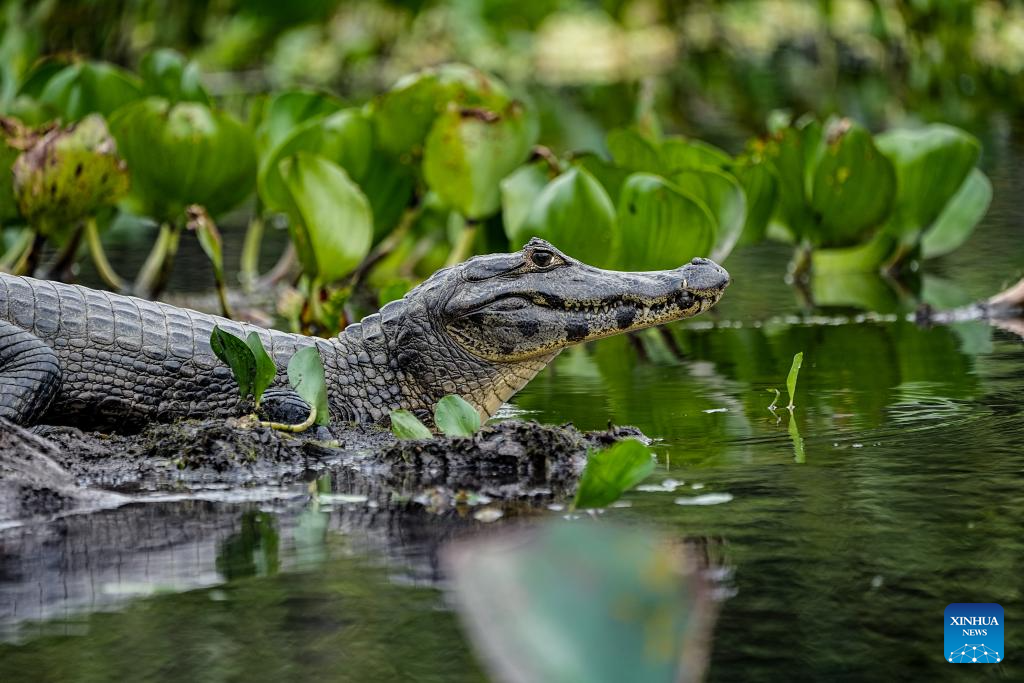 MATO GROSSO DO SUL, 9 agosto, 2025 (Xinhua) -- Imagen del 7 de agosto de 2025 de un caimán yacaré descansando en la orilla del río Salobra, en el Pantanal Sur, en la ciudad de Miranda, en el estado de Mato Grosso do Sul, Brasil. (Xinhua/Paulo Lopes)
