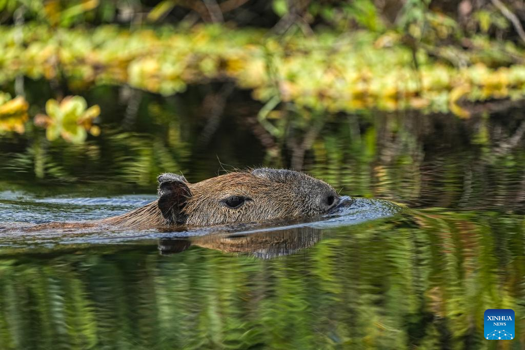 MATO GROSSO DO SUL, 9 agosto, 2025 (Xinhua) -- Imagen del 7 de agosto de 2025 de un capibara nadando en el río Salobra, en el Pantanal Sur, en la ciudad de Miranda, en el estado de Mato Grosso do Sul, Brasil. (Xinhua/Paulo Lopes)