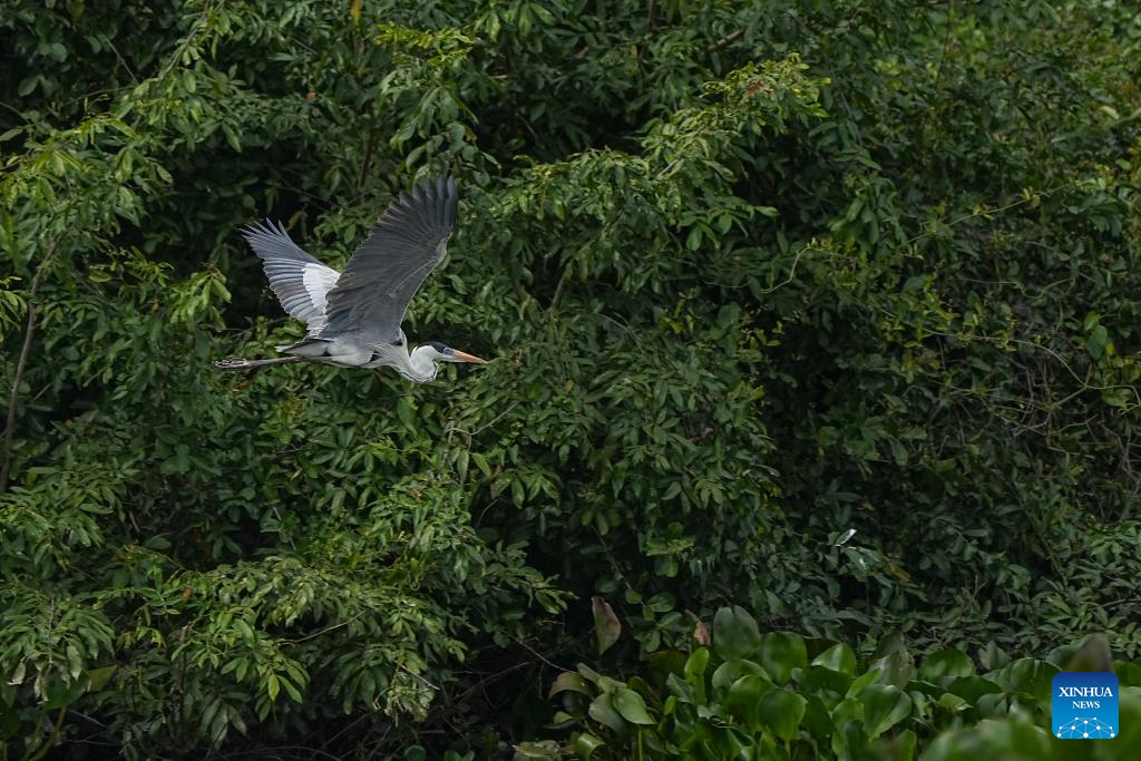MATO GROSSO DO SUL, 9 agosto, 2025 (Xinhua) -- Imagen del 7 de agosto de 2025 de una garza cuca volando en el Pantanal Sur, en la ciudad de Miranda, en el estado de Mato Grosso do Sul, Brasil. (Xinhua/Paulo Lopes)