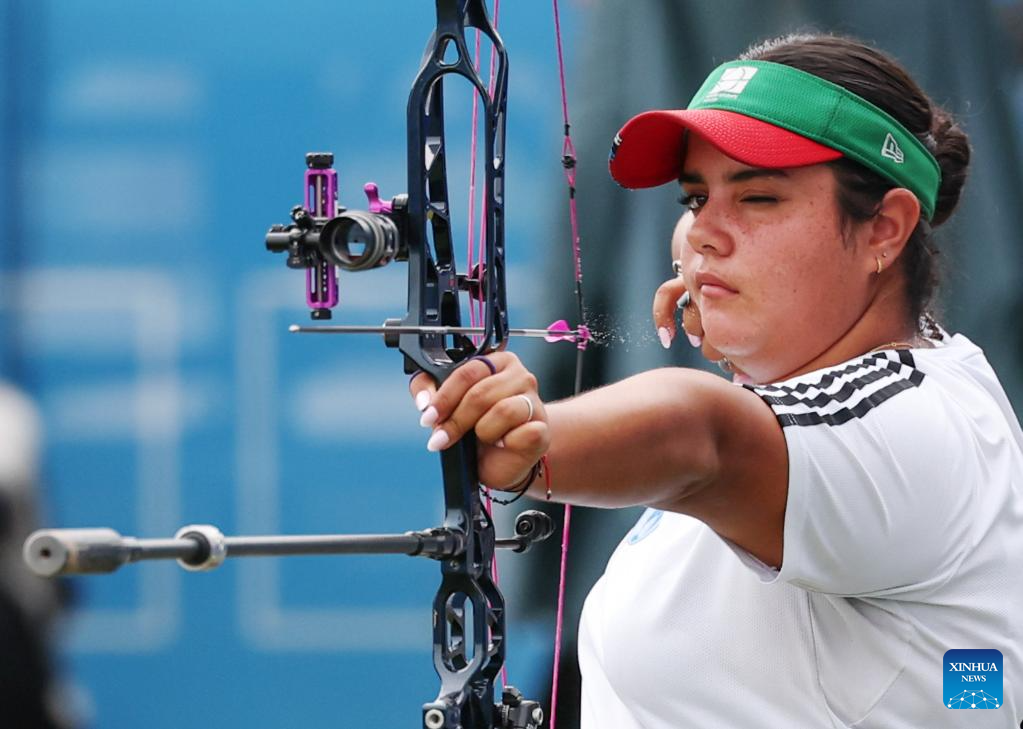 CHENGDU, 9 agosto, 2025 (Xinhua) -- Andrea Maya Becerra Arizaga, de México, compite ante Lisell Jaatma, de Estonia, durante el encuentro por la medalla de oro de compuesto femenino en el evento de tiro con arco en los Juegos Mundiales 2025, en Chengdu, en la provincia de Sichuan, en el suroeste de China, el 9 de agosto de 2025. (Xinhua/Chen Cheng)