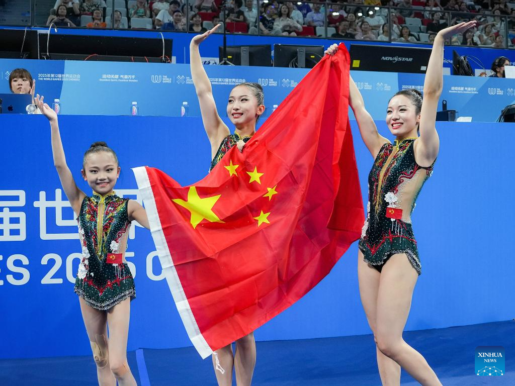 CHENGDU, 9 agosto, 2025 (Xinhua) -- (De izq. a der.) Gu Quanjia, Ding Wenyan y Ma Yixing, de China, saludan al público al término de la final de grupos femeninos del evento de gimnasia acrobática en los Juegos Mundiales 2025, en Chengdu, en la provincia de Sichuan, en el suroeste de China, el 9 de agosto de 2025. (Xinhua/Wang Xi)