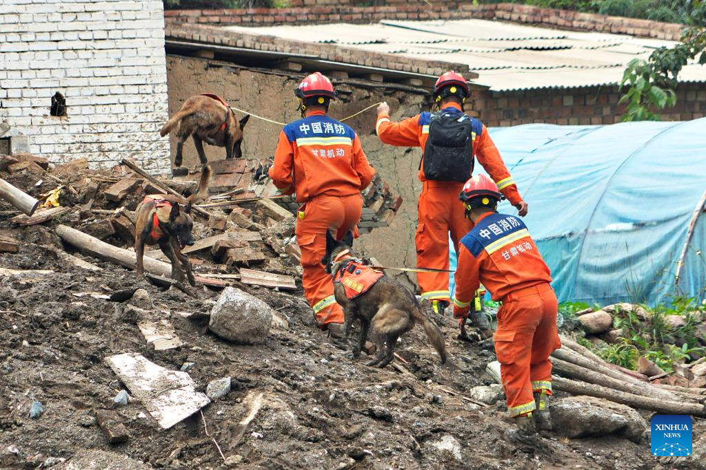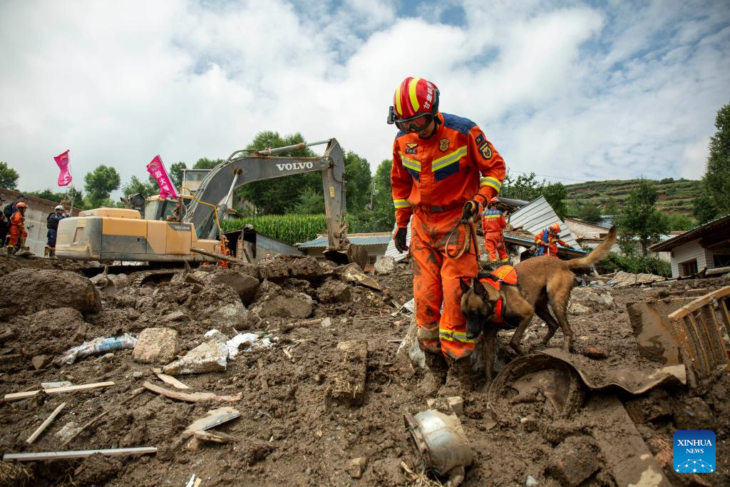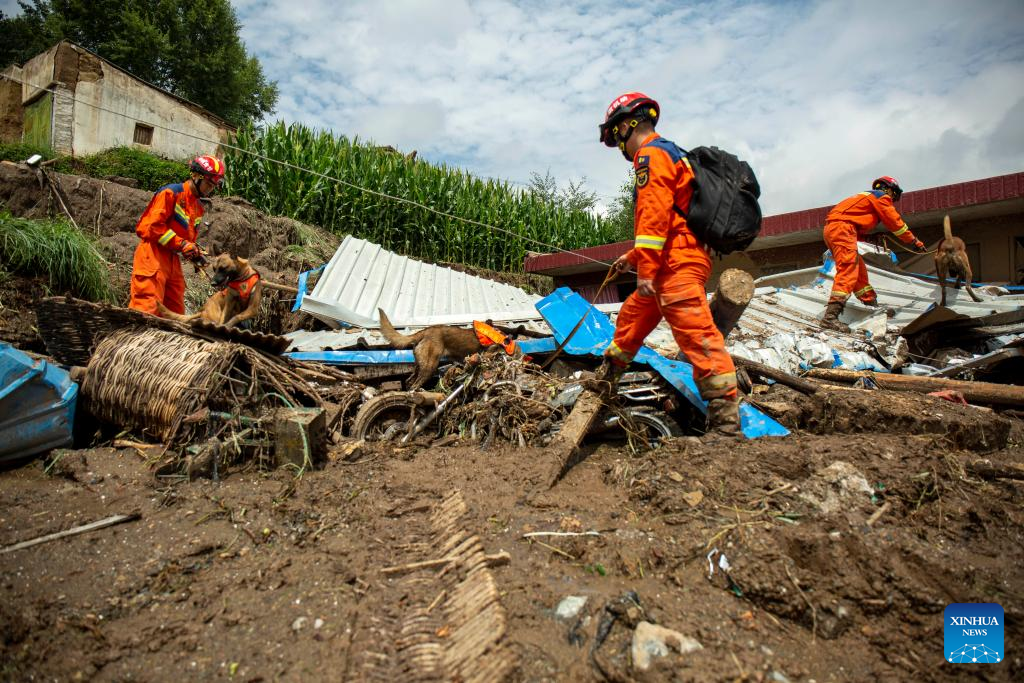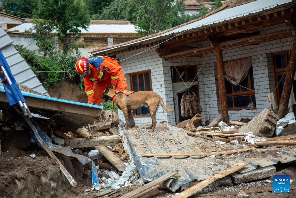 YUZHONG, 9 agosto, 2025 (Xinhua) -- Rescatistas buscan personas desaparecidas con perros de búsqueda y rescate, en la aldea de Jiuzhuanggou del poblado de Mapo, en el condado de Yuzhong de la provincia de Gansu, en el noroeste de China, el 9 de agosto de 2025. Las labores de rescate siguen en marcha luego de que lluvias fuertes y continuas provocaran torrentes de montaña en el condado de Yuzhong. (Xinhua)