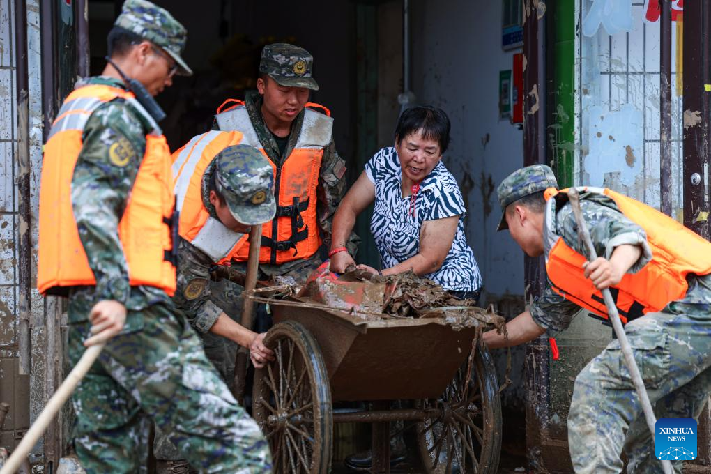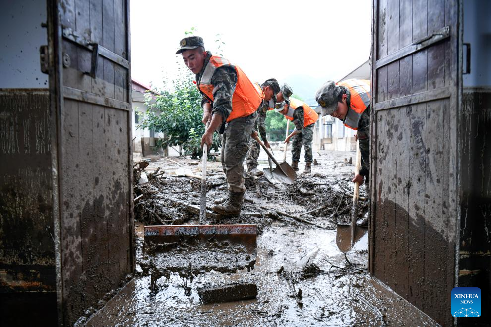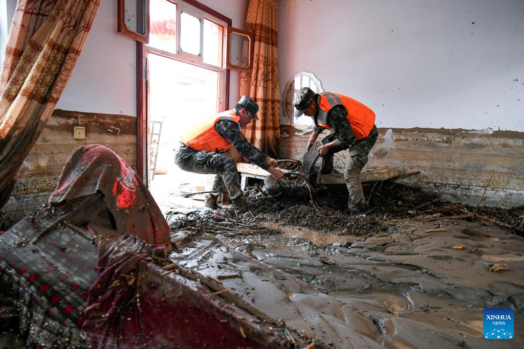 YUZHONG, 9 agosto, 2025 (Xinhua) -- Rescatistas retiran escombros afuera de las viviendas de los aldeanos afectados por el desastre, en el poblado de Chengguan del condado de Yuzhong, en la ciudad de Lanzhou, en la provincia de Gansu, en el noroeste de China, el 9 de agosto de 2025. Las labores de rescate siguen en marcha luego de que lluvias fuertes y continuas provocaran torrentes de montaña en el condado de Yuzhong. (Xinhua/Hou Chonghui)