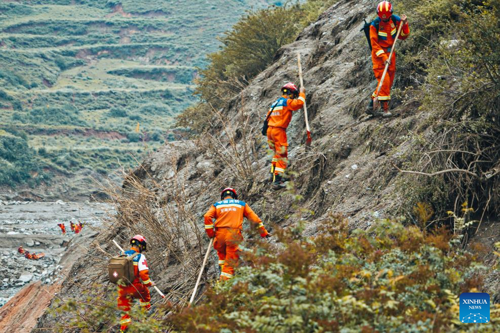 YUZHONG, 9 agosto, 2025 (Xinhua) -- Rescatistas buscan personas desaparecidas, en la aldea de Jiuzhuanggou del poblado de Mapo, en el condado de Yuzhong de la provincia de Gansu, en el noroeste de China, el 9 de agosto de 2025. Las labores de rescate siguen en marcha luego de que lluvias fuertes y continuas provocaran torrentes de montaña en el condado de Yuzhong. (Xinhua)