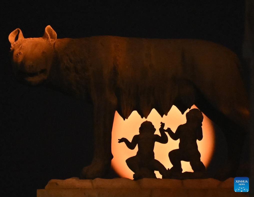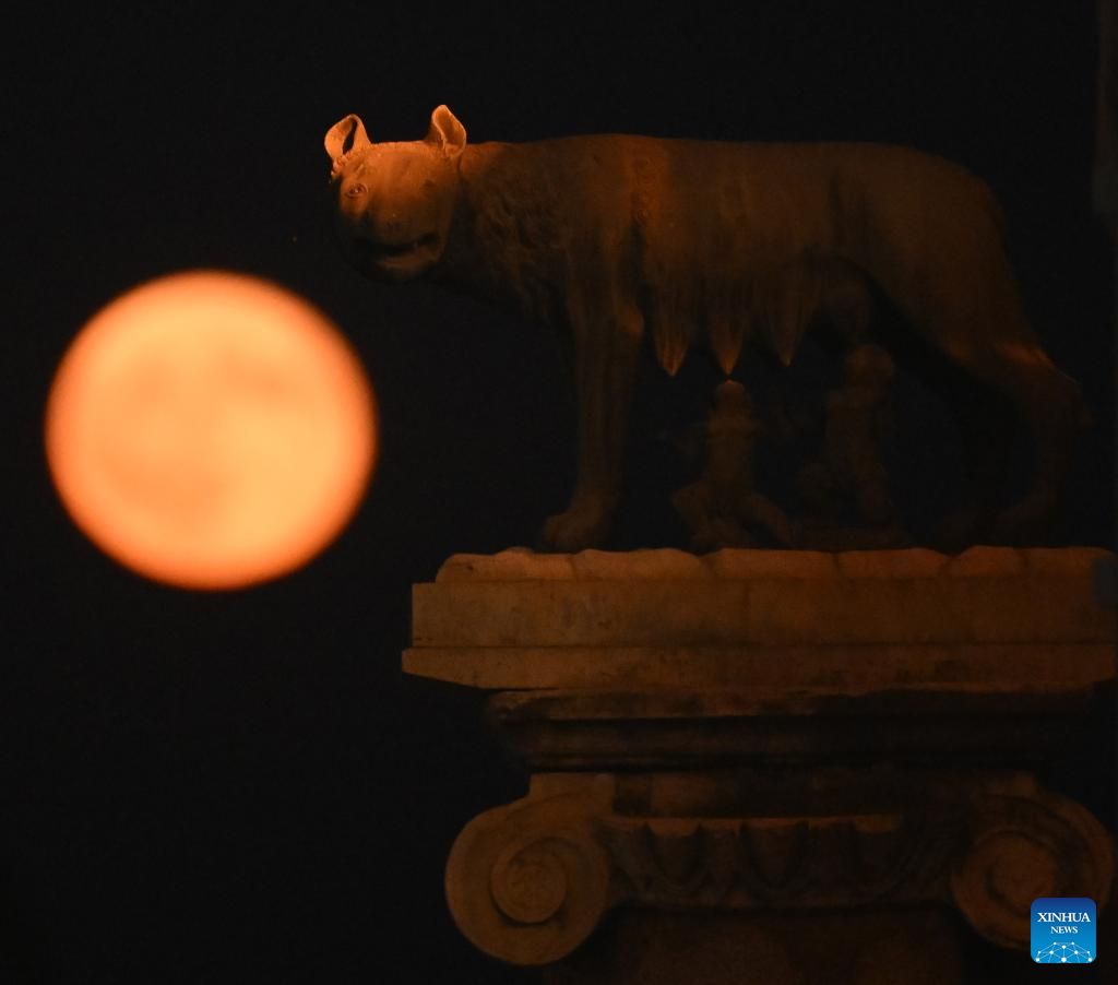 ROMA, 10 agosto, 2025 (Xinhua) -- Imagen del 9 de agosto de 2025 de una luna llena y la estatua de la Loba Capitolina, en Roma, Italia. (Xinhua/Alberto Lingria)
