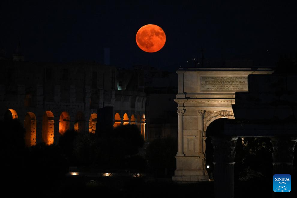 ROMA, 10 agosto, 2025 (Xinhua) -- Imagen del 9 de agosto de 2025 de una luna llena vista sobre el Coliseo y el Foro Imperial, en Roma, Italia. (Xinhua/Alberto Lingria)