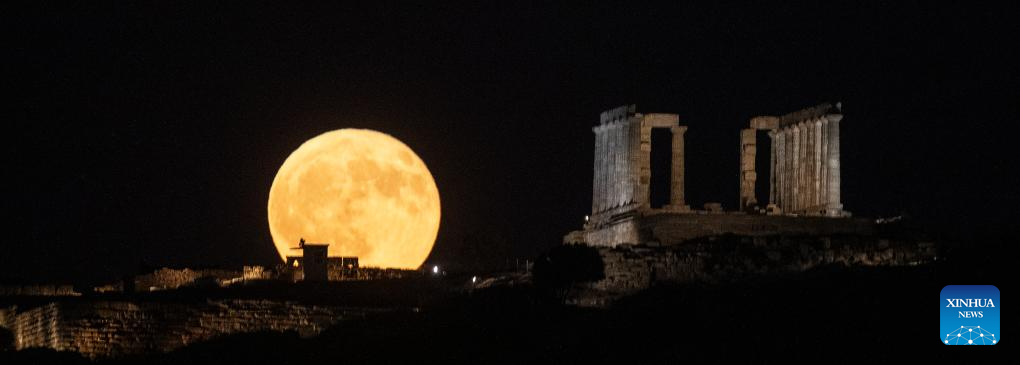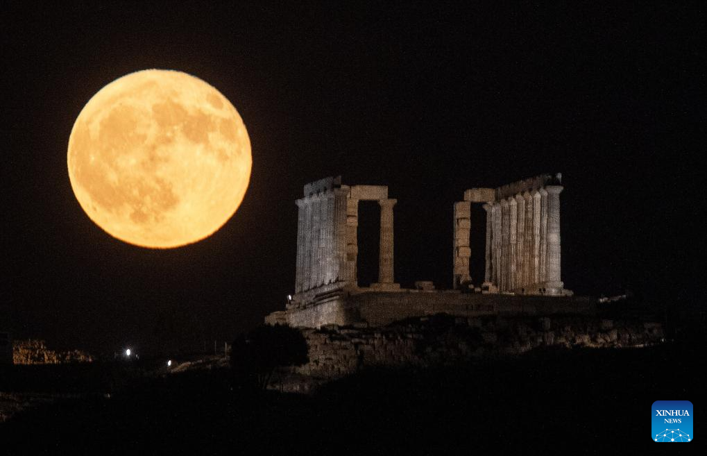 ATENAS, 10 agosto, 2025 (Xinhua) -- Imagen del 9 de agosto de 2025 de una luna llena elevándose sobre el Antiguo Templo de Poseidón en el Cabo Sunión, en Sunión, Grecia. (Xinhua/Marios Lolos)