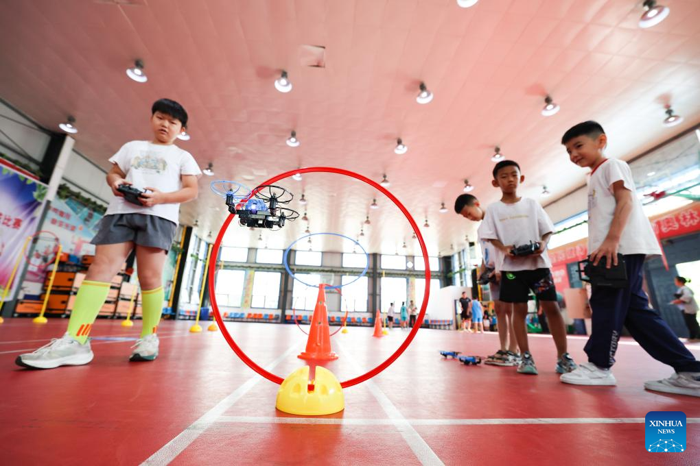 BEIJING, 10 agosto, 2025 (Xinhua) -- Niños juegan a controlar minidrones, en la ciudad de Jinzhou, en la provincia de Hebei, en el norte de China, el 10 de agosto de 2025. Niños de toda China participan en diversas actividades para pasar el verano. (Xinhua/Liang Zidong)