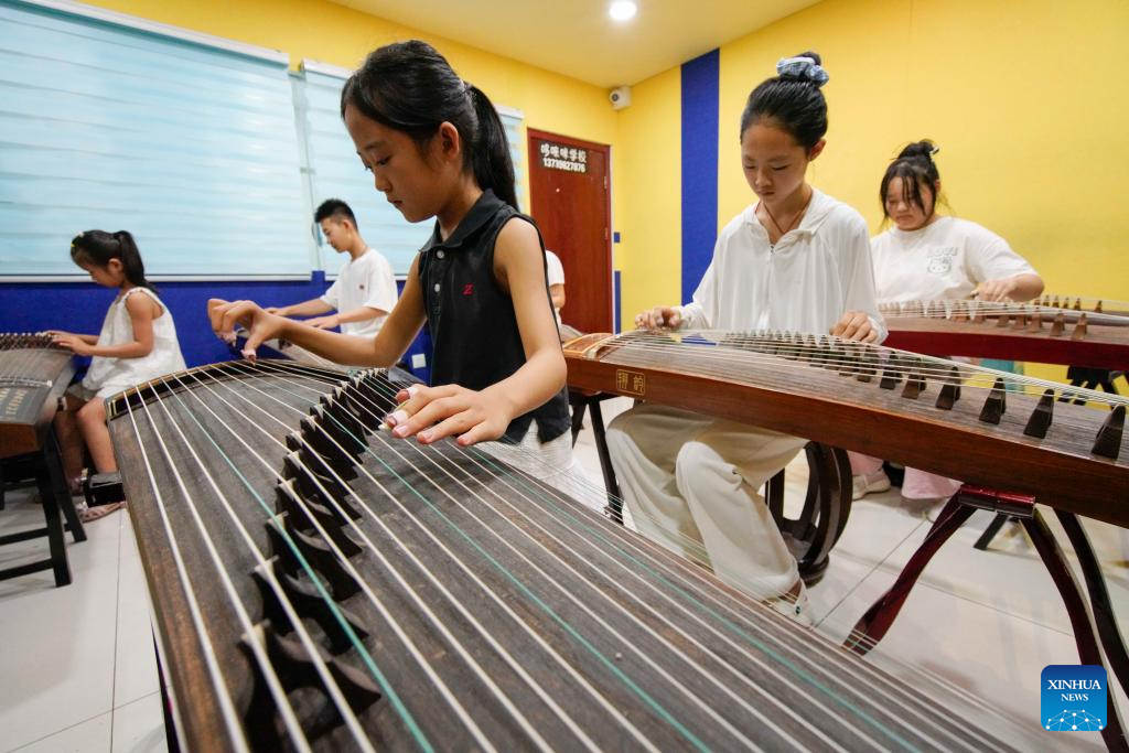 BEIJING, 10 agosto, 2025 (Xinhua) -- Niños aprenden a tocar el Guzheng, un instrumento musical tradicional chino, en la ciudad de Zunhua, en la provincia de Hebei, en el norte de China, el 10 de agosto de 2025. Niños de toda China participan en diversas actividades para pasar el verano. (Xinhua/Liu Mancang)