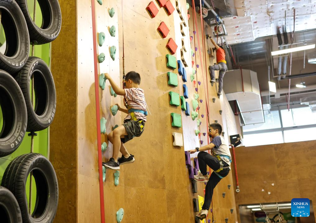BEIJING, 10 agosto, 2025 (Xinhua) -- Niños prueban la escalada deportiva, en el distrito de Wuchang, en la ciudad de Wuhan, en la provincia de Hubei, en el centro de China, el 10 de agosto de 2025. Niños de toda China participan en diversas actividades para pasar el verano. (Xinhua/Zhao Jun)