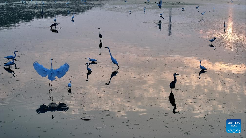BEIJING, 11 agosto, 2025 (Xinhua) -- Imagen tomada con un dron el 7 de agosto de 2025 de garzas blancas alimentándose en un humedal, en la ciudad de Gaomi, en la provincia de Shandong, en el este de China. (Xinhua/Li Haitao)